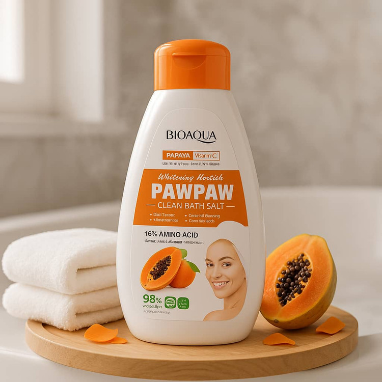 این محصول نمک حمام پاک کننده پاپایا برند BIOAQUA است که برای روشن کردن و تغذیه پوست طراحی شده است.ا